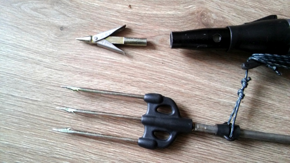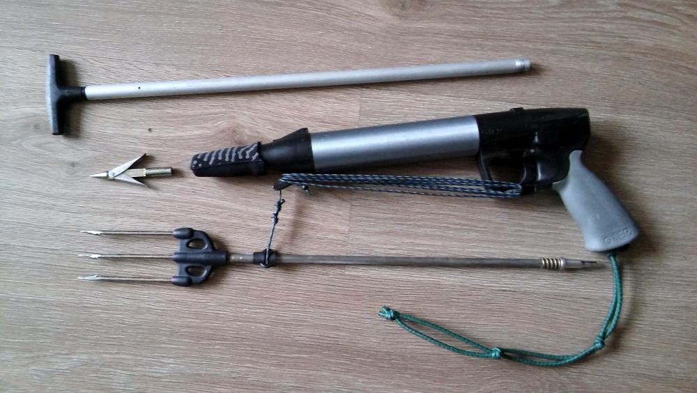 strzała z gwintem M7, dwa różnej specyfiki groty pojedynczy i trójzębny, linka dyneema o wytrzymałosci 240 kg, oryginalna, sprawna pompka
