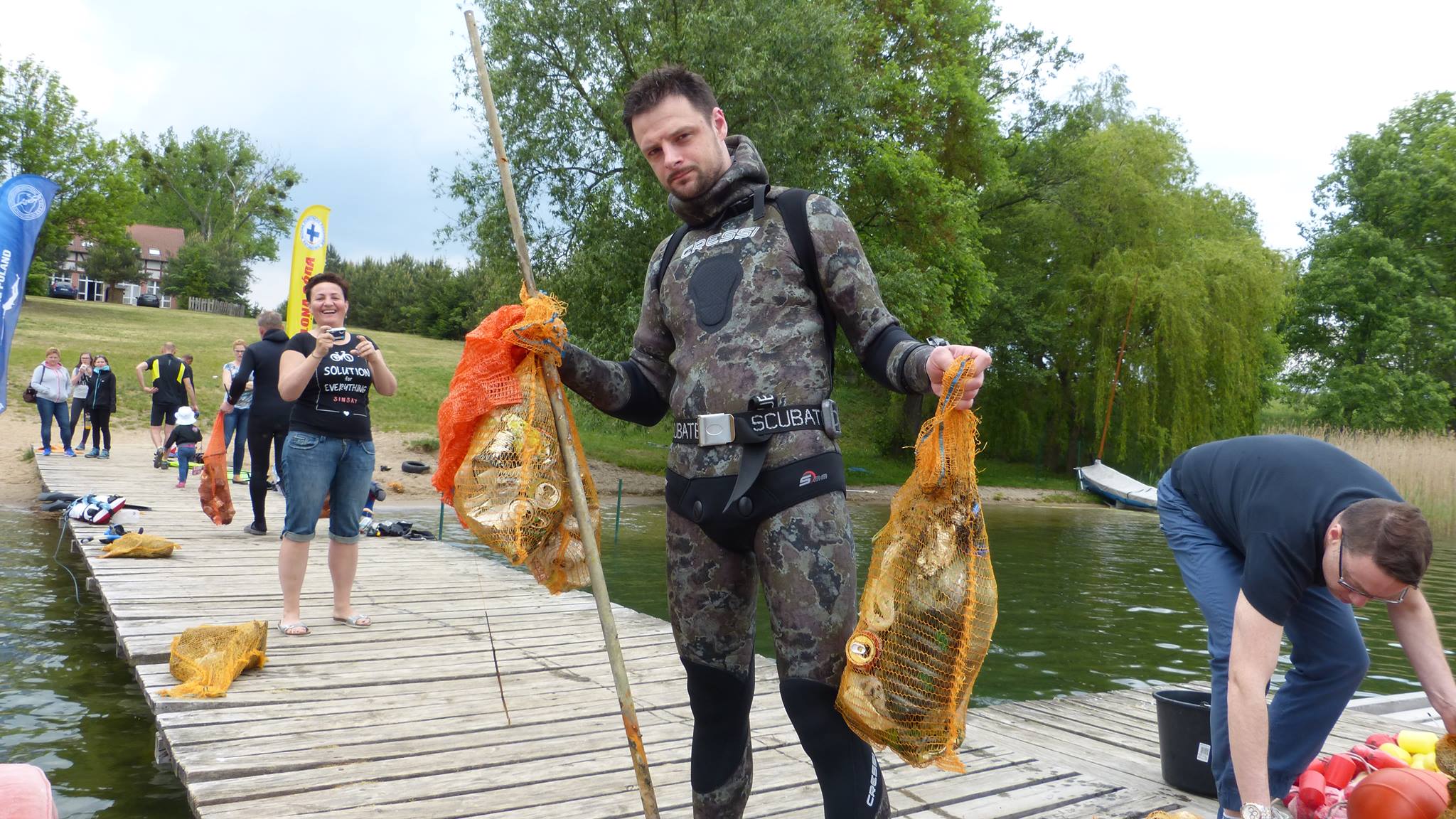 W sobotę niemal wszyscy na nogach już w okolicy godziny dziesiątej, wypoczęci, zwarci i gotowi czekali na akcję sprzątania. Tamtejsze powietrze posiada iście magiczne właściwości... Sprzęt przygotowany, łodzie i ponton też, worki rozdzielone między łowców, zapasowe na łodziach. Jeszcze tylko odprawa i do wody. Tę sprawnie poprowadził Marek. Uczestnicy podzieleni zostali na grupy, każdej przypisano odpowiedni rejon, wcześniej wytypowany do sprzątania dna. Jeszcze tylko podstawowe informacje przypominające zasady bezpieczeństwa i porozumiewania się na wodzie i po chwili motorówka prowadzona przez Mikołaja śmigała z pierwszymi łowcami uzbrojonymi tym razem w worki na śmieci. Kilkuosobowa grupa pojechała kamperami Grzegorza i Jarka w wyznaczony rejon na plaży głównej w Lubikowie. Tam dzielnie wspierał ich łodzią kolega z miejscowej Społecznej Straży Rybackiej. Akcja objęła spory kawałek brzegu. Kilkunastu łowców przez 3 godziny pracowicie wybierało z dna wstydliwe dowody ludzkiej bezmyślności. Puszki po piwie, butelki, konserwy, reklamówki, a z grubszych fantów opona, bęben pralki czy spory kanister to dowód na to, że coroczna akcja jest potrzebna. Pozytywny natomiast wydaje się fakt, że przy większej ilości zaangażowanych ludzi niż przed rokiem, śmieci wydało się być mniej. Oby ten trend się utrzymał! Akcja zakończona została ok. godziny 14-tej. Mikołaj na zmianę z Markiem dwoili się i troili, żeby sprawnie pozbierać wszystkich kolegów wraz ze „zdobyczami” z wody. Wszyscy cali i zdrowi, choć nieco zmęczeni zameldowali się w bazie na pomoście. Po akcji, gdy jedni zalegli na ławkach, gdzie sącząc z rozkoszą zimne napoje i spożywając posiłek umilali sobie czas pogawędkami, inni po krótkim odpoczynku zaczęli przygotowywać się jeszcze na wejście do wody na polowanie. Rozpoczęcie sezonu wszak zobowiązuje.