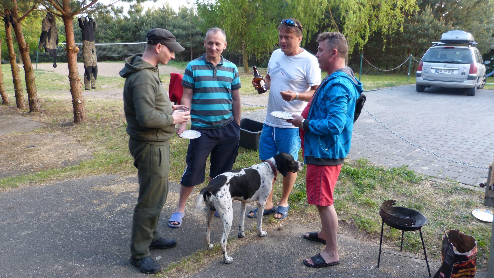 Popołudniem grono powiększyło się już dość znacząco. Na miejsce dotarła silna czteroosobowa załoga z Lubina, czyli Arkadiuszy dwóch, Piotrek i Damian, kolejna dwójka kolegów w swoich domach na kółkach, czyli Grzegorz i Jarek, następnie Maciej z żoną Moniką i owczarkiem Yogim ze Szczecina, Grzegorz z małżonką z Bolesławca, znowu wrocławianie, czyli Andrzej i Lech z małżonkami, oraz oczywiście człowiek, którego zna każdy podwodny łowca i bez którego nie odbędzie się żadna łowiecka impreza w Polsce, czyli Zając Jerzy we własnej osobie. Godny reprezentant Jeleniej Góry, który zaszczycił nas swoją obecnością wraz z kolegą Zbyszkiem. Nie mogło oczywiście zabraknąć też naszego nadwornego ratownika z WOPR Zielona Góra, Mikołaja Bombały, na którego fachową wiedzę ratowniczą, sokoli wzrok i szybką motorówkę liczymy wszyscy wchodząc do wody.