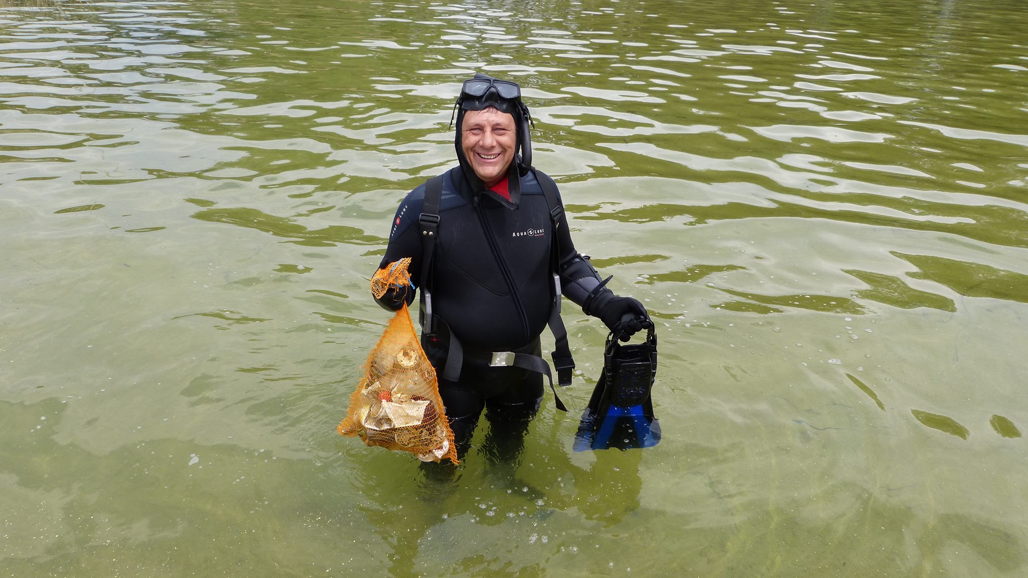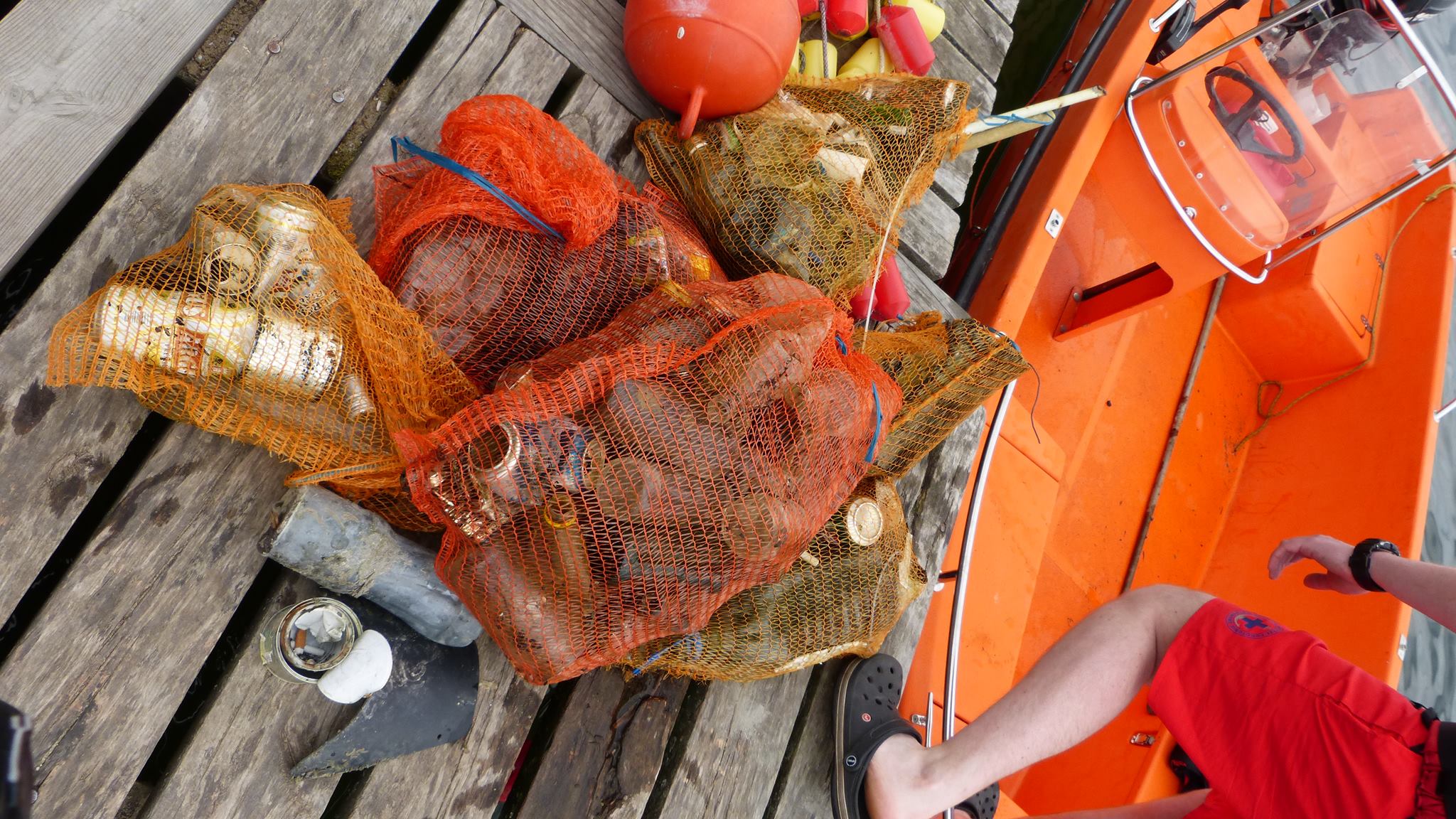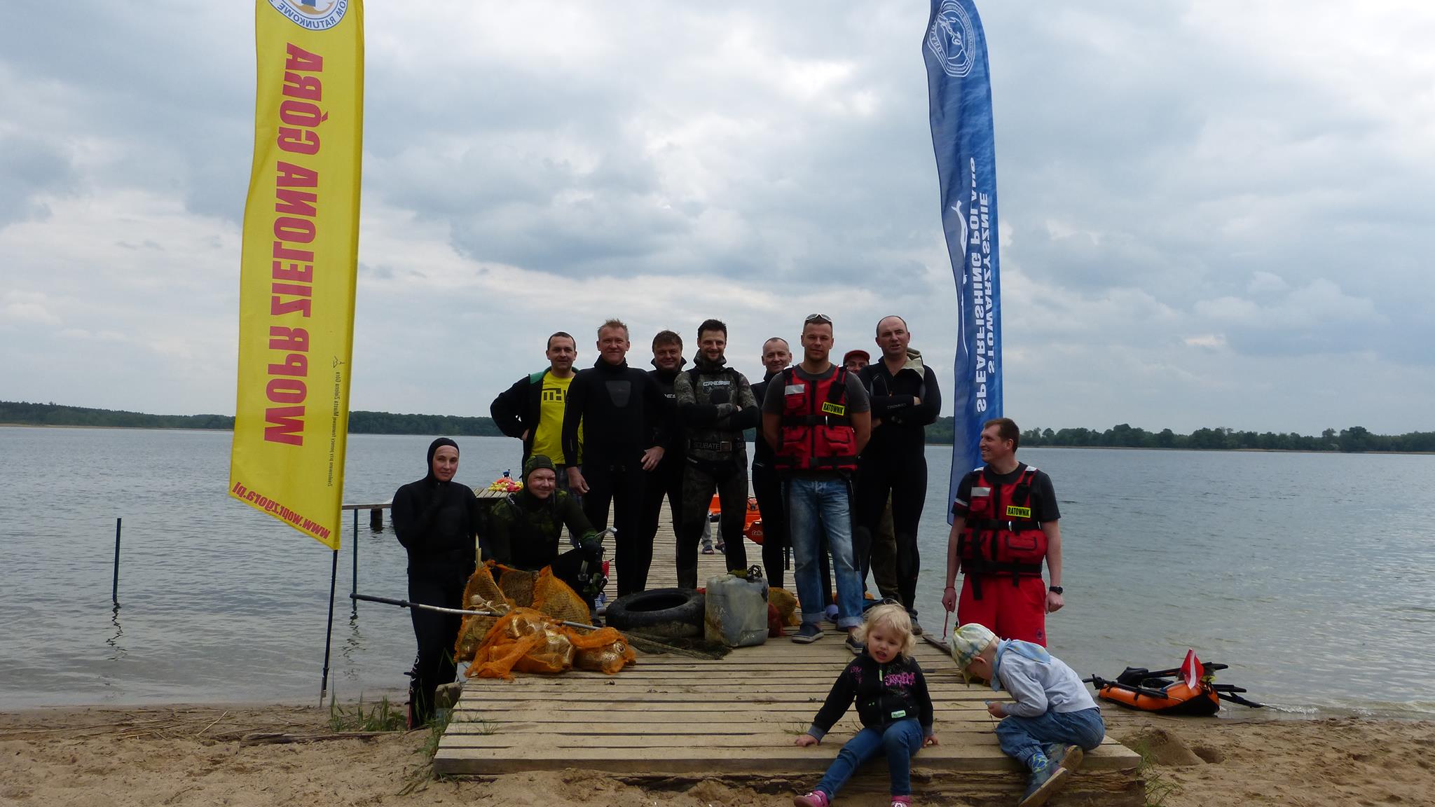 W sobotę niemal wszyscy na nogach już w okolicy godziny dziesiątej, wypoczęci, zwarci i gotowi czekali na akcję sprzątania. Tamtejsze powietrze posiada iście magiczne właściwości... Sprzęt przygotowany, łodzie i ponton też, worki rozdzielone między łowców, zapasowe na łodziach. Jeszcze tylko odprawa i do wody. Tę sprawnie poprowadził Marek. Uczestnicy podzieleni zostali na grupy, każdej przypisano odpowiedni rejon, wcześniej wytypowany do sprzątania dna. Jeszcze tylko podstawowe informacje przypominające zasady bezpieczeństwa i porozumiewania się na wodzie i po chwili motorówka prowadzona przez Mikołaja śmigała z pierwszymi łowcami uzbrojonymi tym razem w worki na śmieci. Kilkuosobowa grupa pojechała kamperami Grzegorza i Jarka w wyznaczony rejon na plaży głównej w Lubikowie. Tam dzielnie wspierał ich łodzią kolega z miejscowej Społecznej Straży Rybackiej. Akcja objęła spory kawałek brzegu. Kilkunastu łowców przez 3 godziny pracowicie wybierało z dna wstydliwe dowody ludzkiej bezmyślności. Puszki po piwie, butelki, konserwy, reklamówki, a z grubszych fantów opona, bęben pralki czy spory kanister to dowód na to, że coroczna akcja jest potrzebna. Pozytywny natomiast wydaje się fakt, że przy większej ilości zaangażowanych ludzi niż przed rokiem, śmieci wydało się być mniej. Oby ten trend się utrzymał! Akcja zakończona została ok. godziny 14-tej. Mikołaj na zmianę z Markiem dwoili się i troili, żeby sprawnie pozbierać wszystkich kolegów wraz ze „zdobyczami” z wody. Wszyscy cali i zdrowi, choć nieco zmęczeni zameldowali się w bazie na pomoście. Po akcji, gdy jedni zalegli na ławkach, gdzie sącząc z rozkoszą zimne napoje i spożywając posiłek umilali sobie czas pogawędkami, inni po krótkim odpoczynku zaczęli przygotowywać się jeszcze na wejście do wody na polowanie. Rozpoczęcie sezonu wszak zobowiązuje.