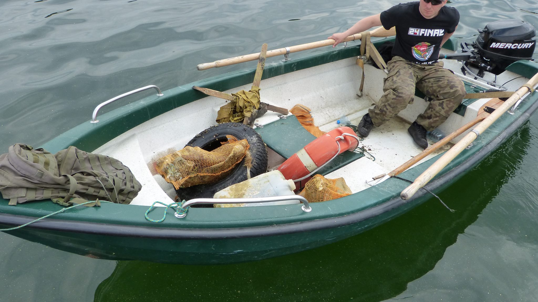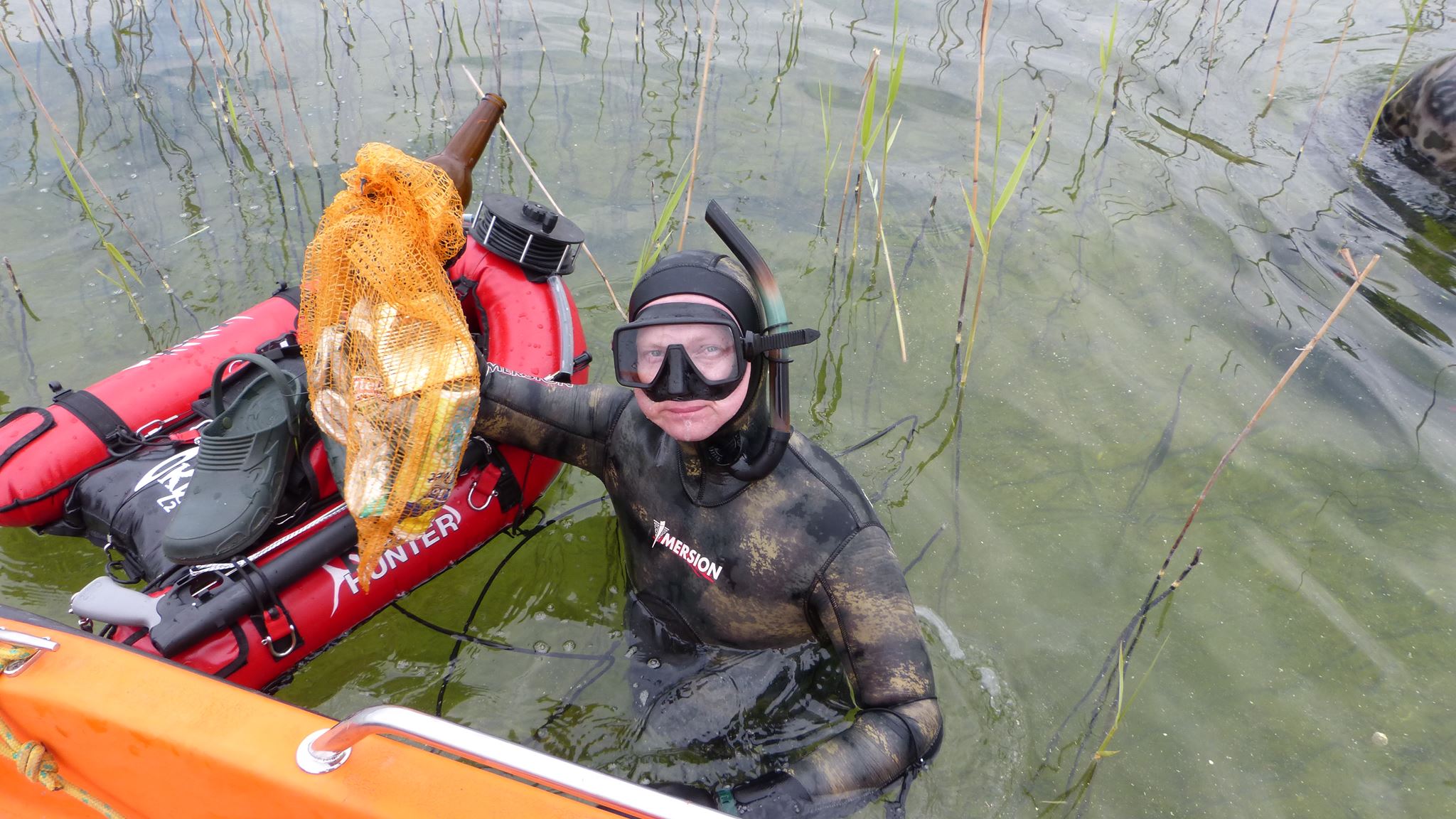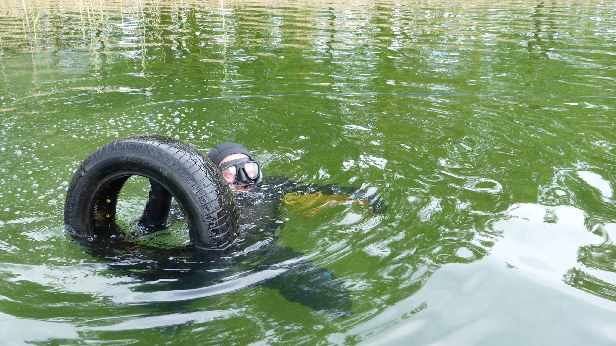 W sobotę niemal wszyscy na nogach już w okolicy godziny dziesiątej, wypoczęci, zwarci i gotowi czekali na akcję sprzątania. Tamtejsze powietrze posiada iście magiczne właściwości... Sprzęt przygotowany, łodzie i ponton też, worki rozdzielone między łowców, zapasowe na łodziach. Jeszcze tylko odprawa i do wody. Tę sprawnie poprowadził Marek. Uczestnicy podzieleni zostali na grupy, każdej przypisano odpowiedni rejon, wcześniej wytypowany do sprzątania dna. Jeszcze tylko podstawowe informacje przypominające zasady bezpieczeństwa i porozumiewania się na wodzie i po chwili motorówka prowadzona przez Mikołaja śmigała z pierwszymi łowcami uzbrojonymi tym razem w worki na śmieci. Kilkuosobowa grupa pojechała kamperami Grzegorza i Jarka w wyznaczony rejon na plaży głównej w Lubikowie. Tam dzielnie wspierał ich łodzią kolega z miejscowej Społecznej Straży Rybackiej. Akcja objęła spory kawałek brzegu. Kilkunastu łowców przez 3 godziny pracowicie wybierało z dna wstydliwe dowody ludzkiej bezmyślności. Puszki po piwie, butelki, konserwy, reklamówki, a z grubszych fantów opona, bęben pralki czy spory kanister to dowód na to, że coroczna akcja jest potrzebna. Pozytywny natomiast wydaje się fakt, że przy większej ilości zaangażowanych ludzi niż przed rokiem, śmieci wydało się być mniej. Oby ten trend się utrzymał! Akcja zakończona została ok. godziny 14-tej. Mikołaj na zmianę z Markiem dwoili się i troili, żeby sprawnie pozbierać wszystkich kolegów wraz ze „zdobyczami” z wody. Wszyscy cali i zdrowi, choć nieco zmęczeni zameldowali się w bazie na pomoście. Po akcji, gdy jedni zalegli na ławkach, gdzie sącząc z rozkoszą zimne napoje i spożywając posiłek umilali sobie czas pogawędkami, inni po krótkim odpoczynku zaczęli przygotowywać się jeszcze na wejście do wody na polowanie. Rozpoczęcie sezonu wszak zobowiązuje.