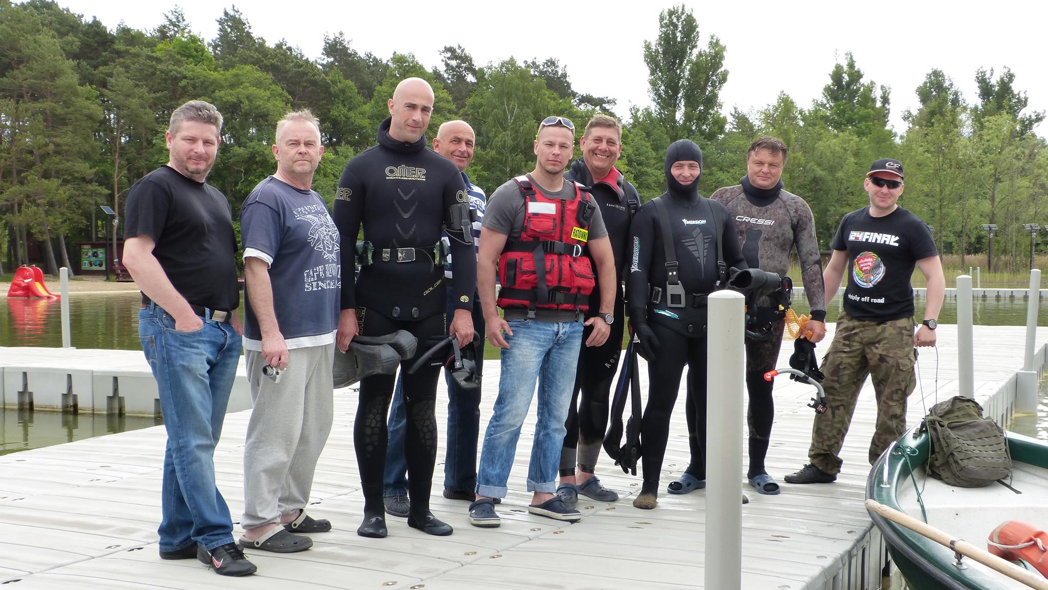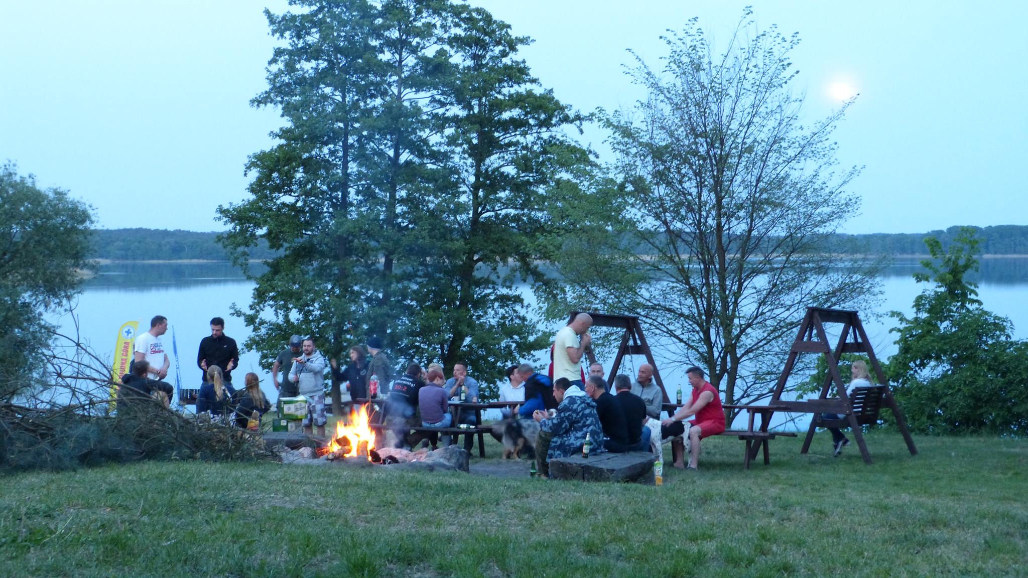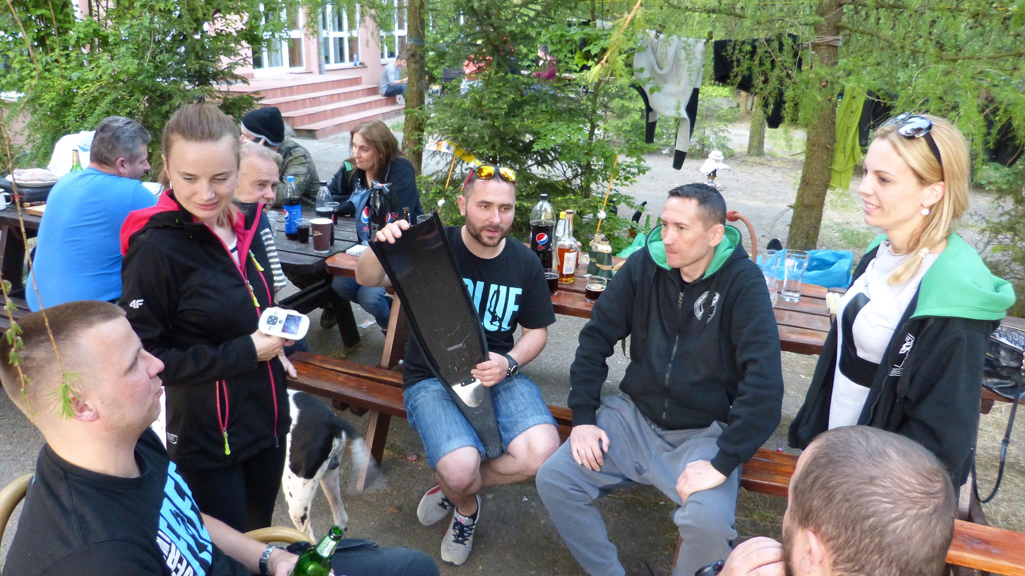 Popołudniem grono powiększyło się już dość znacząco. Na miejsce dotarła silna czteroosobowa załoga z Lubina, czyli Arkadiuszy dwóch, Piotrek i Damian, kolejna dwójka kolegów w swoich domach na kółkach, czyli Grzegorz i Jarek, następnie Maciej z żoną Moniką i owczarkiem Yogim ze Szczecina, Grzegorz z małżonką z Bolesławca, znowu wrocławianie, czyli Andrzej i Lech z małżonkami, oraz oczywiście człowiek, którego zna każdy podwodny łowca i bez którego nie odbędzie się żadna łowiecka impreza w Polsce, czyli Zając Jerzy we własnej osobie. Godny reprezentant Jeleniej Góry, który zaszczycił nas swoją obecnością wraz z kolegą Zbyszkiem. Nie mogło oczywiście zabraknąć też naszego nadwornego ratownika z WOPR Zielona Góra, Mikołaja Bombały, na którego fachową wiedzę ratowniczą, sokoli wzrok i szybką motorówkę liczymy wszyscy wchodząc do wody.