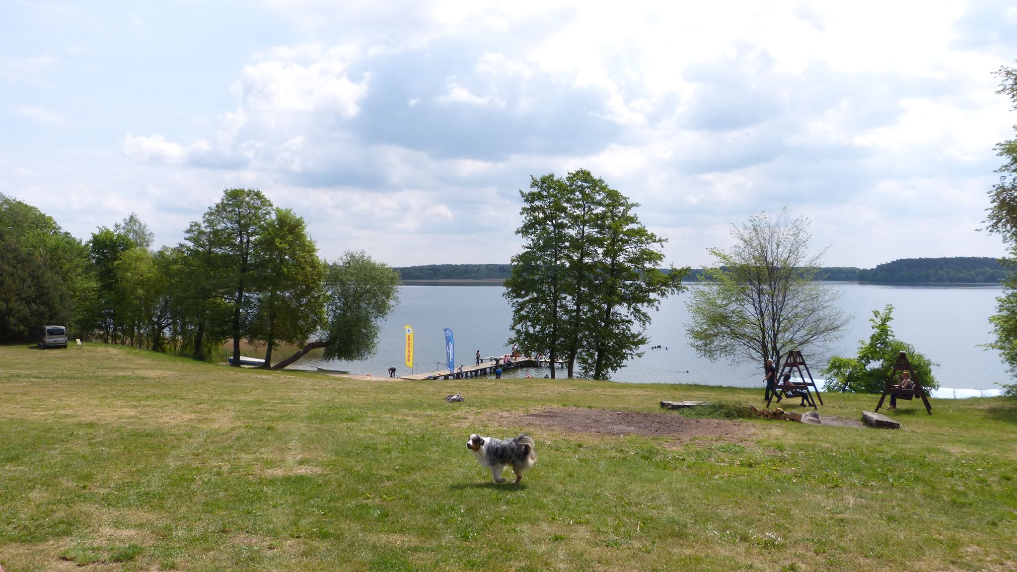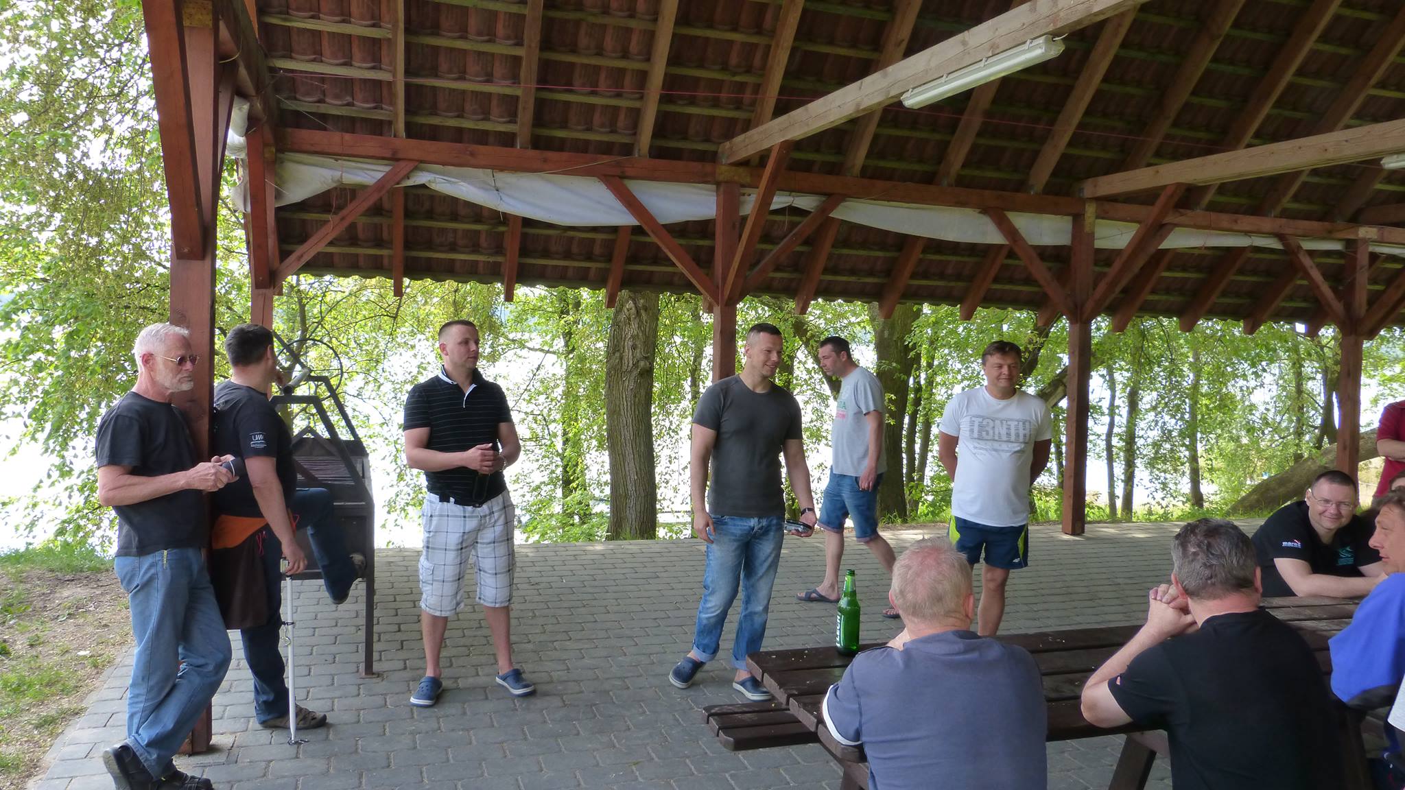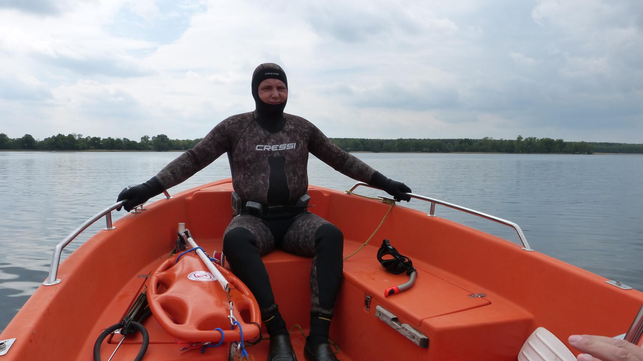 Popołudniem grono powiększyło się już dość znacząco. Na miejsce dotarła silna czteroosobowa załoga z Lubina, czyli Arkadiuszy dwóch, Piotrek i Damian, kolejna dwójka kolegów w swoich domach na kółkach, czyli Grzegorz i Jarek, następnie Maciej z żoną Moniką i owczarkiem Yogim ze Szczecina, Grzegorz z małżonką z Bolesławca, znowu wrocławianie, czyli Andrzej i Lech z małżonkami, oraz oczywiście człowiek, którego zna każdy podwodny łowca i bez którego nie odbędzie się żadna łowiecka impreza w Polsce, czyli Zając Jerzy we własnej osobie. Godny reprezentant Jeleniej Góry, który zaszczycił nas swoją obecnością wraz z kolegą Zbyszkiem. Nie mogło oczywiście zabraknąć też naszego nadwornego ratownika z WOPR Zielona Góra, Mikołaja Bombały, na którego fachową wiedzę ratowniczą, sokoli wzrok i szybką motorówkę liczymy wszyscy wchodząc do wody.