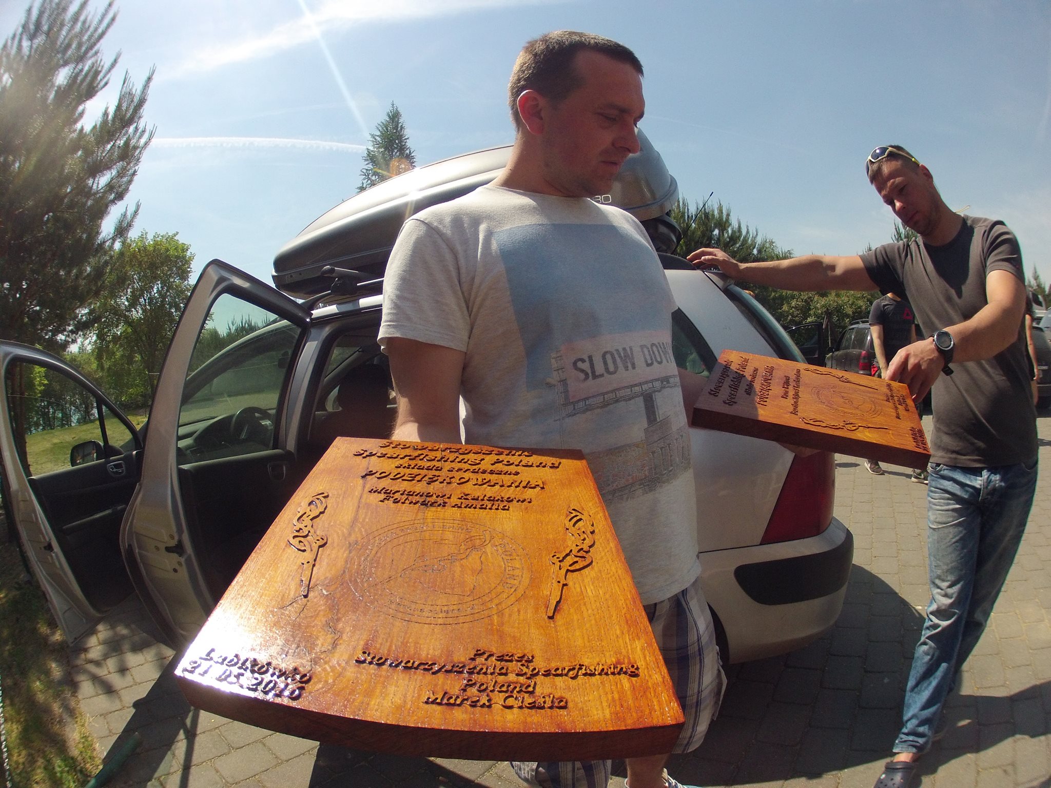 W piątek już od samego rana zaczęli przybywać kolejni łowcy. Pierwsi pojawili się Krzysiek i Paweł reprezentujący Inowrocław oraz Konrad z Zielonej Góry. Kolega Konrad, choć to jego pierwsza impreza w naszym gronie, już zapisał się w pamięci pozostałych jako doskonały inżynier, człowiek, który ma tysiąc pomysłów i żadnej pracy się nie boi. Szczególnie tej na tokarce. Przywiózł ze sobą własnoręcznie zaprojektowaną i wykonaną zautomatyzowaną wędzarnię, pięknie wykonane z dębowego drewna tablice z podziękowaniami dla sponsorów i instytucji wspierających nasze działania oraz bojki do oznaczania zauważonych w wodzie narzędzi kłusowniczych. Kawał włożonego czasu i pracy zrobił na wszystkich spore wrażenie. Serdecznie witamy Kolegę na pokładzie SSP!